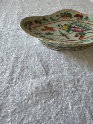 縁が花柄なフリルなシルエットで手の込んだ美しいデザインです。ひとつひとつ手描きの絵柄がチャイナなテイストで一気に引き込まれてしまいますね。